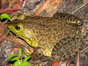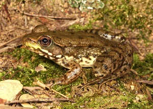 The green frog (Lithobates clamitans) is a medium-sized frog, rarely measuring more than 10 cm long, found throughout eastern North America, from south-eastern Canada to the northern coast of the Gulf of Mexico. In the northern part of their range, green frogs are more brownish than green with darker markings, sometimes appearing blue because of a lacking colour pigment. They have two well-developed ridges running from the eyes to the lower back and their eardrums are distinctively larger than their eyes. Green frogs are common in and around any permanent shallow water bodies and are recognized by their banjo-like gunk call.