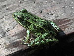 The northern leopard frog (Lithobates pipiens) is a widespread medium-sized frog, measuring a little over 10 cm long, found from Newfoundland to British Columbia and from Maine to Washington. Northern leopard frogs have a light stripe on the upper jaw, two well-developed ridges running from the eyes to the lower back, and are often marked with rounded dark spots on the back, sides, and legs. They are found almost anywhere, sometimes away from water like in woodlands or meadows. Their snore-like rattling call best distinguishes them.