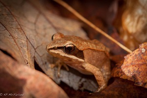The wood frog (Lithobates sylvaticus) is a medium-sized frog widespread across woodlands of northern North America, including all Canadian provinces and territories. It is the only amphibian found above the Arctic Circle. Wood frogs have adapted to cold by producing anti-freeze chemicals. Their colour varies between different shades of brown with a dark raccoon-like face mask widening from the nose to include the eardrum. They have a duck-like quacking call.
