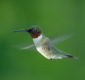 Hummingbirds are the smallest of all birds, most species measuring less than 5 cm long. They are very fast and agile flyers, with extremely rapid wing beats, and are named after the humming sound made by their rapidly-beating wings. Hummingbirds are glossy coloured and they all feed on flower nectar with their fine, long bill [1]. In North America, species of hummingbirds include Rufous Hummingbirds (Selasphorus rufus) [2] and Calliope Hummingbird (Stellula calliope) [3] in western states and provinces, and the Ruby-throated Hummingbird (Archilochus colubris) [4] in eastern states and provinces.