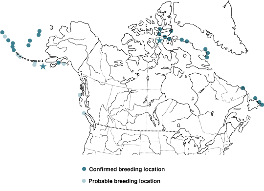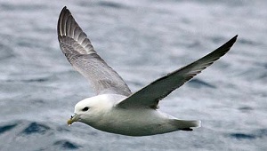 The Northern Fulmar (Fulmarus glacialis) is a long-winged, soaring seabird present in most North American oceans and breeding from Alaska to eastern Canada. Fulmars are related to albatrosses, but are smaller, rarely weighing over 1 kg, and have merged nostrils into a single tube on top of the bill, instead of separated left and right nostrils. This nostril tube appears to be used in olfactory sensing of prey and perhaps navigational cues. Northern Fulmars are abundant in the North American arctic, but aggregated around large breeding colonies in Newfoundland and Labrador, Baffin and Devon Islands, and the Aleutian Islands in Alaska. Northern Fulmars breed for the first time at 8-10 years of age and pairs produce only one egg per year, but life expectancy exceed 30 years. They eat a wide variety of fish, squid, and krill captured at or very near the sea surface.