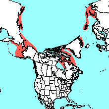 The walrus (Odobenus rosmarus) is the only member of its family and is most closely related to other pinnipeds, like seals and sea lions. Walruses are found in the Arctic where there is shallow water foraging areas and thick enough ice to support their heavy weights. In North America, walruses are divided in two subspecies: the Pacific walrus (O. r. divergens) distributed around Alaska from the Beaufort Sea to the Gulf of Alaska and the Atlantic walrus (O. r. rosmarus) distributed in the western Atlantic Arctic occurring from the eastern Canadian Arctic to Maritime Provinces. Walruses migrate with ice, moving north in spring and south in autumn. The species latin name means “tooth walking sea horse” and the French common name is morse.