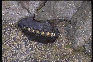 The black katy chiton (Katharina tunicata) is a primitive marine mollusk occurring along the North American Pacific coast from Alaska to California. In black katy chitons, the thick shinny black griddle covers almost all the whitish dorsal plates, except for diamond shapes along a mid-dorsal ridge. Their underside has a peach colour and their foot is darker orange. They live for around 3 years and generally grow not much bigger than 10 cm long. Black katy chitons safely secure themselves on rocky shores, from the intertidal zones up to 40 m deep, using their sucker-like foot and are able to resist intense wave action. They first spawn in their second year and southern populations generally spawn in spring, while more northern populations spawn in the summer. Predators of black katy chitons include sea urchins and seabirds [2].