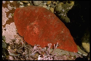 The giant Pacific chiton (Cryptochiton stelleri) is a primitive marine mollusk occurring along the North American Pacific coast from Alaska to California. In the giant Pacific chiton, individual dorsal plates are undistinguishable being entirely covered by a thick leathery reddish brown mantle and the underside is yellowish orange. They are the considered the largest chiton and can grow to over 35 cm long and weigh close to 2 kg. Giant Pacific chitons are most often hidden in kelp beds, secured on rocky bottom, from shallow interdidal waters up to around 20 m deep. They spawn in spring in southern parts of their range and later in the north. Giant Pacific chitons do not have many predators, except for mostly sea snails [3].