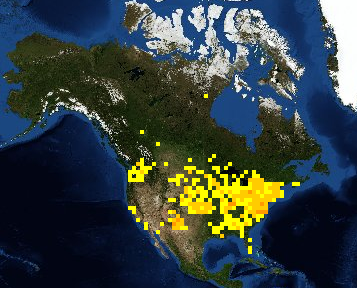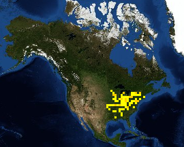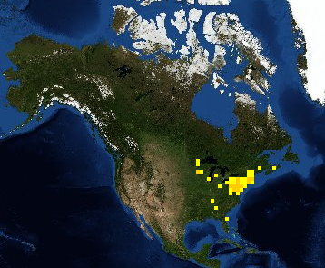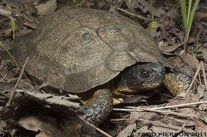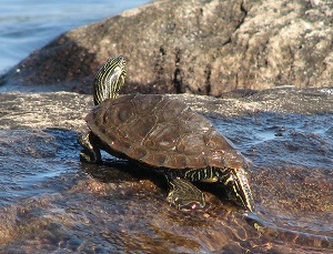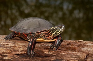 Pond turtles are part of the most modern and diversified family of turtles with the greatest number of species found in North America. They vary in size and shape and from fully aquatic to fully terrestrial. Most species, especially in northern part of their range, hibernate underwater buried into muddy bottoms. The most widely distributed North American pond turtle is the painted turtle (Chrysemys picta), occurring in still or slow-moving water with abundant aquatic vegetation across southern Canada and throughout most of United States. Painted turtles are medium-sized, rarely measuring more than 25 cm long, and are most often seen basking in the sun during the summer. They are easily recognizable from their colourful yellow and red markings on their head, neck, limbs, and carapace. The wood turtle (Glyptemys insculpta) is also a common North American pond turtle that can be found around clear shallow water, but also in forested and open grassy areas of north-eastern United States and south-eastern Canada. They are smaller than painted turtles, with a dome-shaped carapace measuring under 13 cm long, and are brownish with shades of yellow orange. The most aquatic form of pond turtles include the common map turtle (Graptemys geographica), which rarely leaves the water except for basking and nesting. Common map turtles occur from southern Quebec to central United States around large rivers and lakes. They can reach up to 30 cm long and are recognized by the fine pale lines on their neck and limbs closely resembling contour lines on a map.