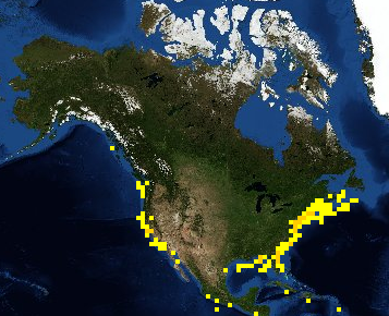 The leatherback sea turtle (Dermochelys coriacea) and the loggerhead sea turtle (Caretta caretta) are two widely distributed sea turtles occurring along both North American coasts, but the former is most often found in open water, while the latter is closely associated with coastal waters. The leatherback sea turtle is the largest turtle of the world and can weigh close to 1000 kg. They have a unique carapace covered by a thin skin similar to fine leather, with seven pronounced ridges serving as keels, and a dark blue to almost black colour dotted with white spots. Their head is quite large and their upper jaw has two deep notches. Leatherbacks can dive up to 1000 m deep and are well-known for their excellent sense of orientation allowing them to travel across the globe and return to their natal beach to reproduce. The loggerhead sea turtle is much smaller, rarely weighing over to 250 kg, and is dark to orange brown with a yellow edge around the carapace. They have a very large head with a horny beak and very powerful jaws to crush the toughest large mollusc shell.