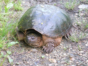 The common snapping turtle (Chelydra serpentina) is the most abundant and most northern of the only two species of snapping turtles. It occurs in almost all aquatic habitats, as long as there is a muddy bottom to hide in, from south-eastern Canada to southern United States. They are a massive turtle, weighing around 35 kg, with a large head, robust and clawed limbs, long crocodile-like tail, and a powerful hooked upper jaw.